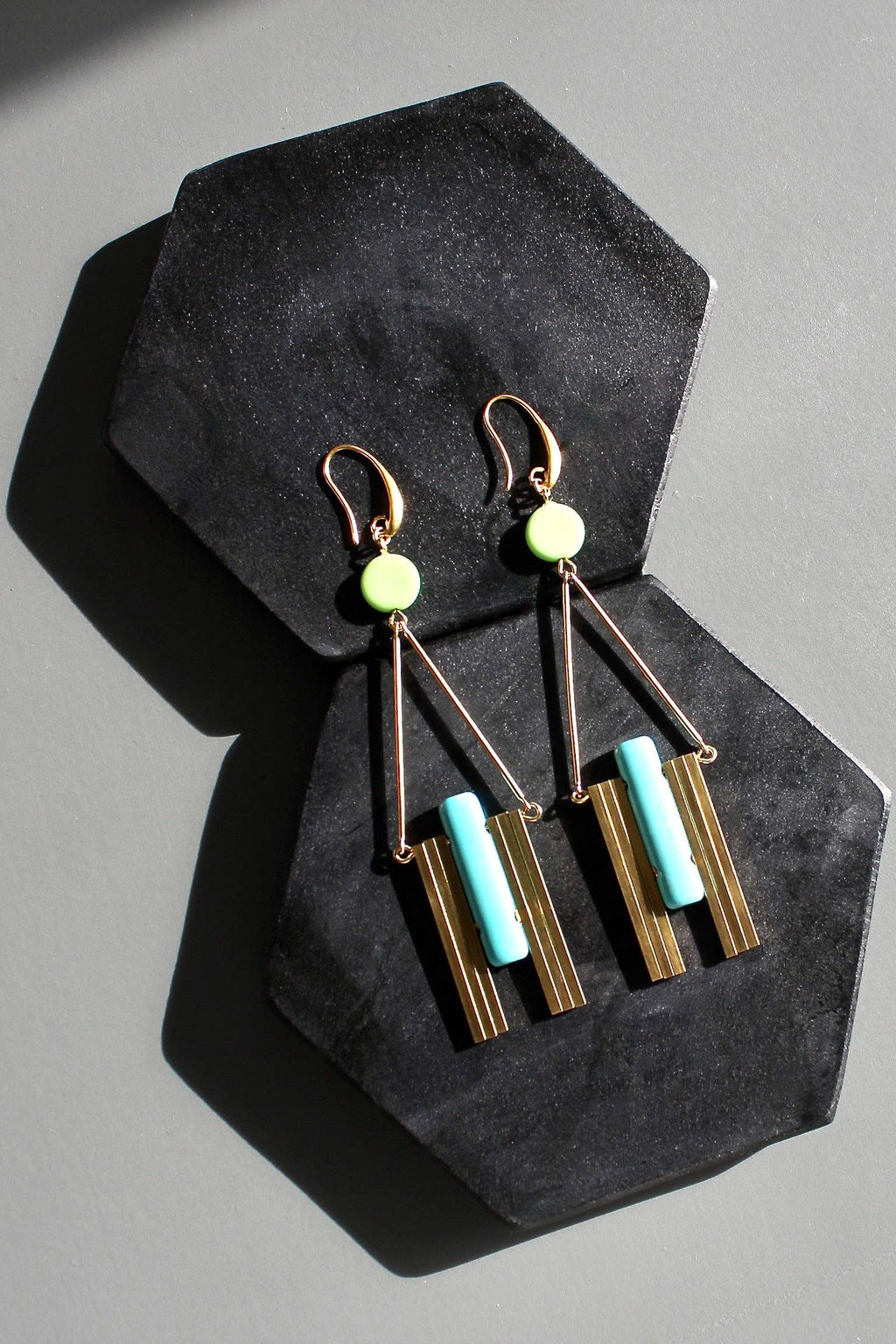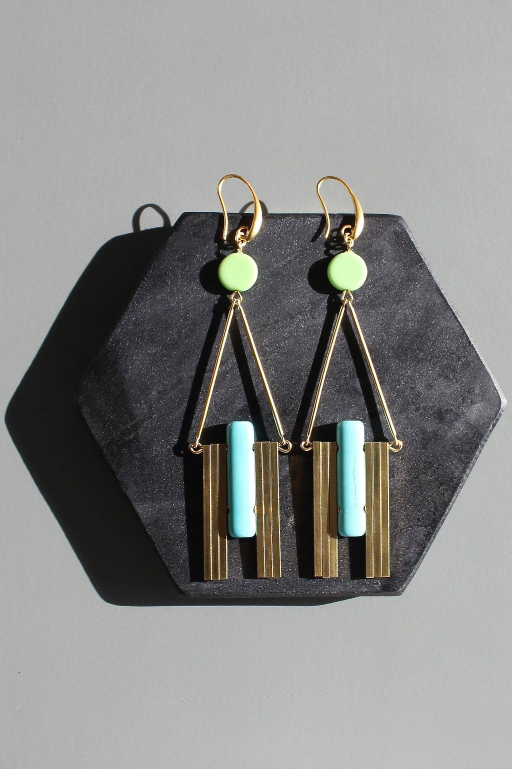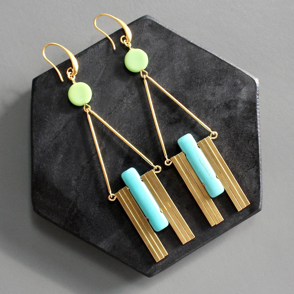 18k gold plated brass hooks with Czech glass, magnesite, and brass bars. Each earring weighs .39 oz. and measures 4.25 inches in length from top to bottom.